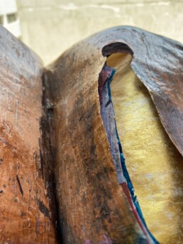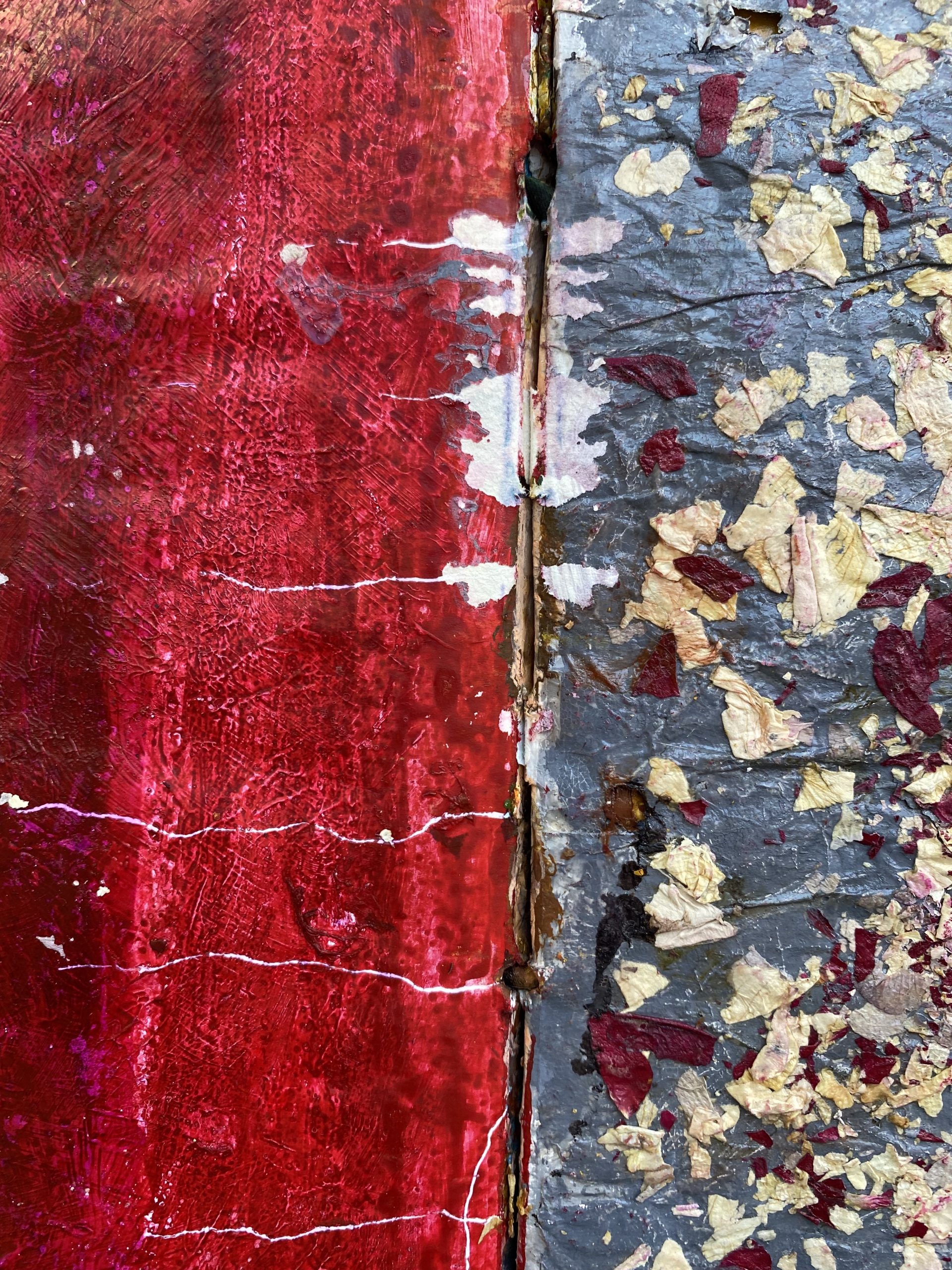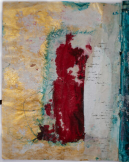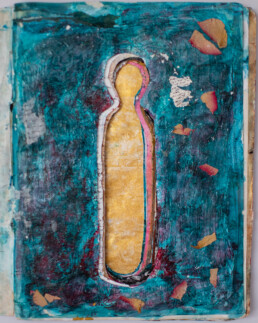 Fragments of a mixed-media book of embodied memories and lived experience. The layers across each page hold stories and contradictions. A cut-out human figure exists through the pages, a self unseen, both absent and present within the world around it.